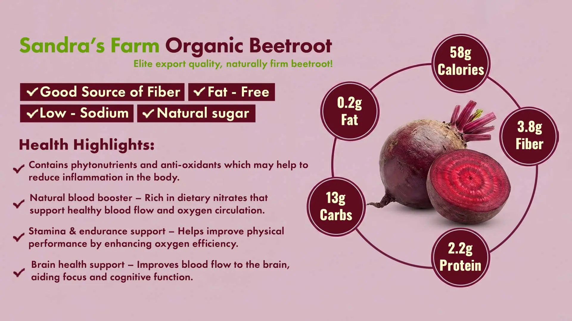 At Sandras Farm Organic Fresh Vegetables, we offer naturally sweet and vibrant beetroots that are organically grown and handpicked from our fields. Packed with essential nutrients, antioxidants, and earthy flavour, our beetroots are perfect for salads, juices, curries, and traditional dishes. Their deep red colour and natural sweetness make them a healthy and delicious addition to your diet. Grown with sustainable farming methods, every beetroot from Sandras Farm is a promise of purity, freshness, and farm-to-table goodness. The product image shown is for representation purposes only. Actual product may vary based on season, produce, and availability.