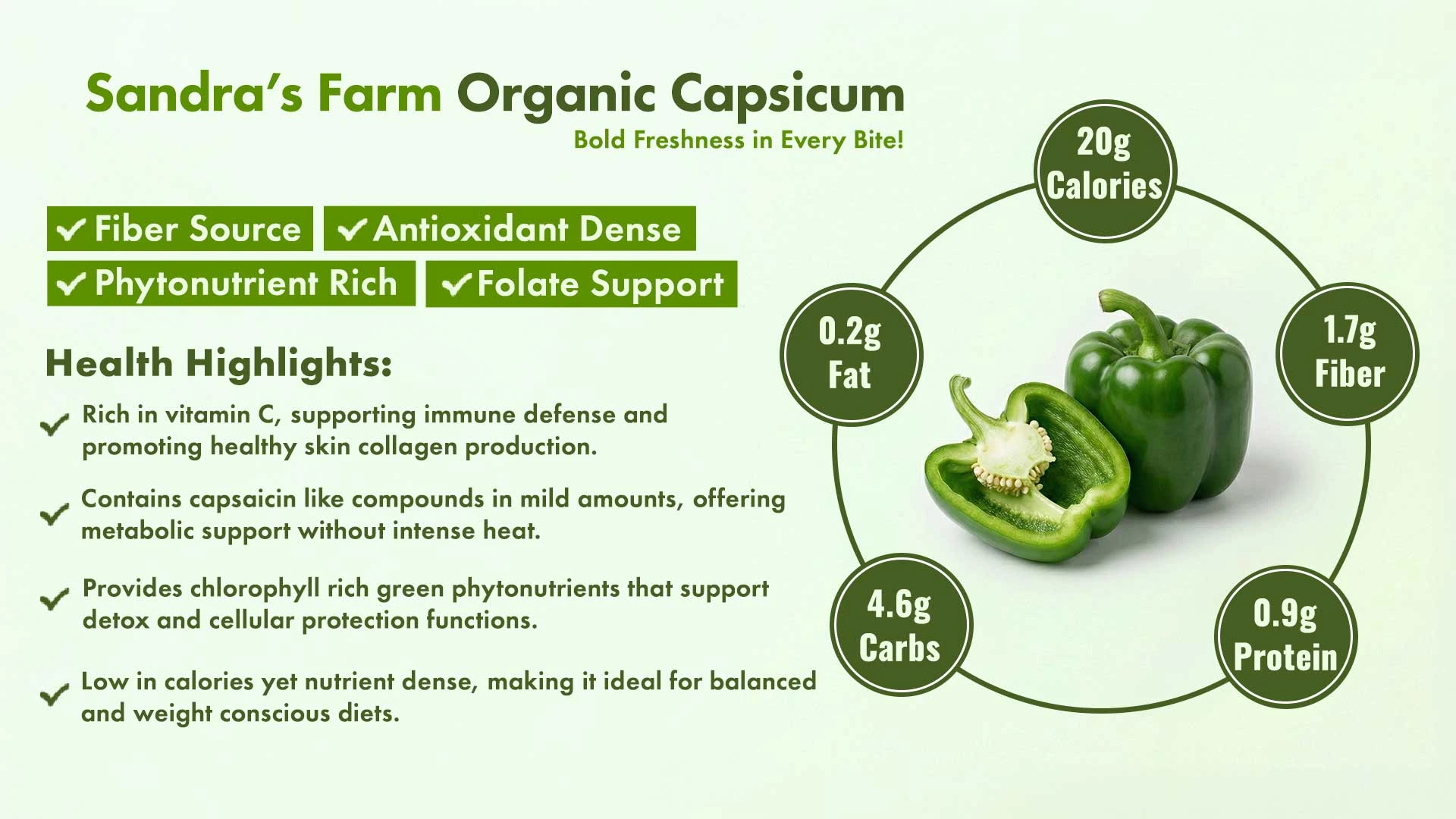 At Sandras Farm Organic Fresh Vegetables, our vibrant organic capsicums (bell peppers) are bursting with color, flavor and essential nutrients. Packed with vitamin C, antioxidants like beta-carotene and fiber, they boost immunity, support eye health and aid digestion while adding natural sweetness to your meals. Perfect for stir-fries, salads, stuffing or vibrant curries, our capsicums deliver farm-fresh crunch and nutrition straight from Tamil Nadu fields to your table.