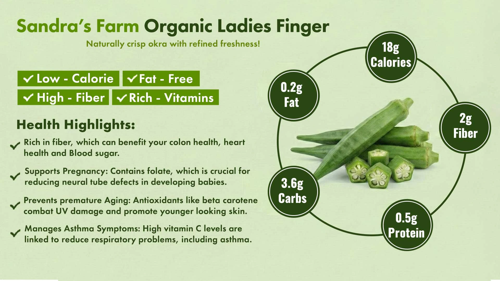 At Sandras Farm Organic Fresh Vegetables, we offer freshly harvested ladies finger (okra) known for its tender texture and delicious taste. Organically grown and handpicked from our lush farms, each pod is fresh, green, and nutrient-rich. Perfect for curries, stir-fries, and traditional dishes, our okra ensures both health and flavour in every meal. Through sustainable and chemical-free farming, Sandras Farm delivers produce that brings natural goodness straight from our fields to your kitchen. The product image shown is for representation purposes only. Actual product may vary based on season, produce, and availability.