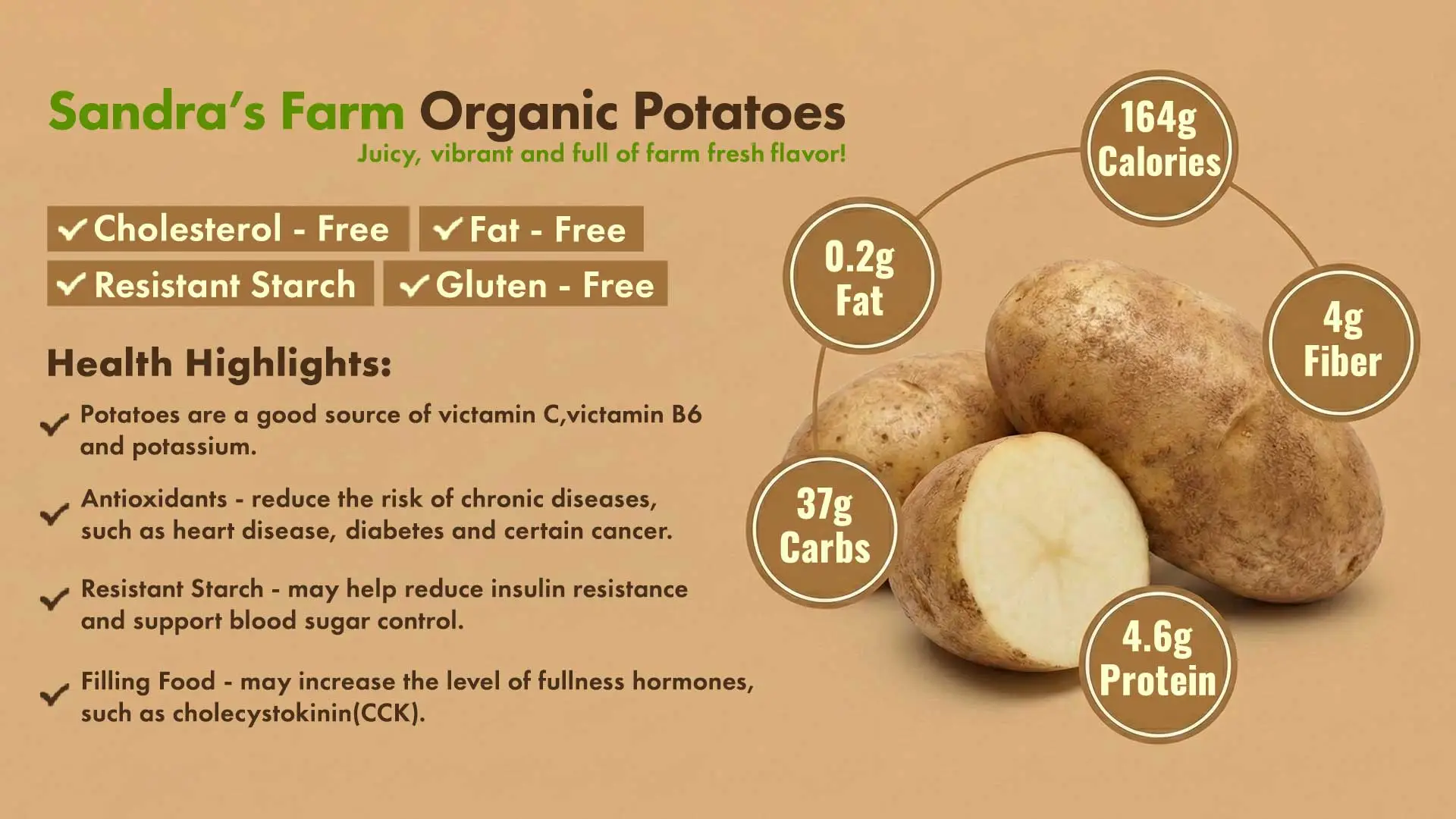 At Sandras Farm Organic Fresh Vegetables, we offer naturally grown, fresh potatoes packed with earthy flavour and wholesome goodness. Our potatoes are organically cultivated and handpicked straight from the farm to ensure premium quality and freshness. Known for their smooth texture and rich taste, they are perfect for boiling, frying, baking, or using in a variety of traditional and modern dishes. Each potato from Sandras Farm reflects our commitment to purity, sustainability, and nutrient-rich produce. The product image shown is for representation purposes only. Actual product may vary based on season, produce, and availability.