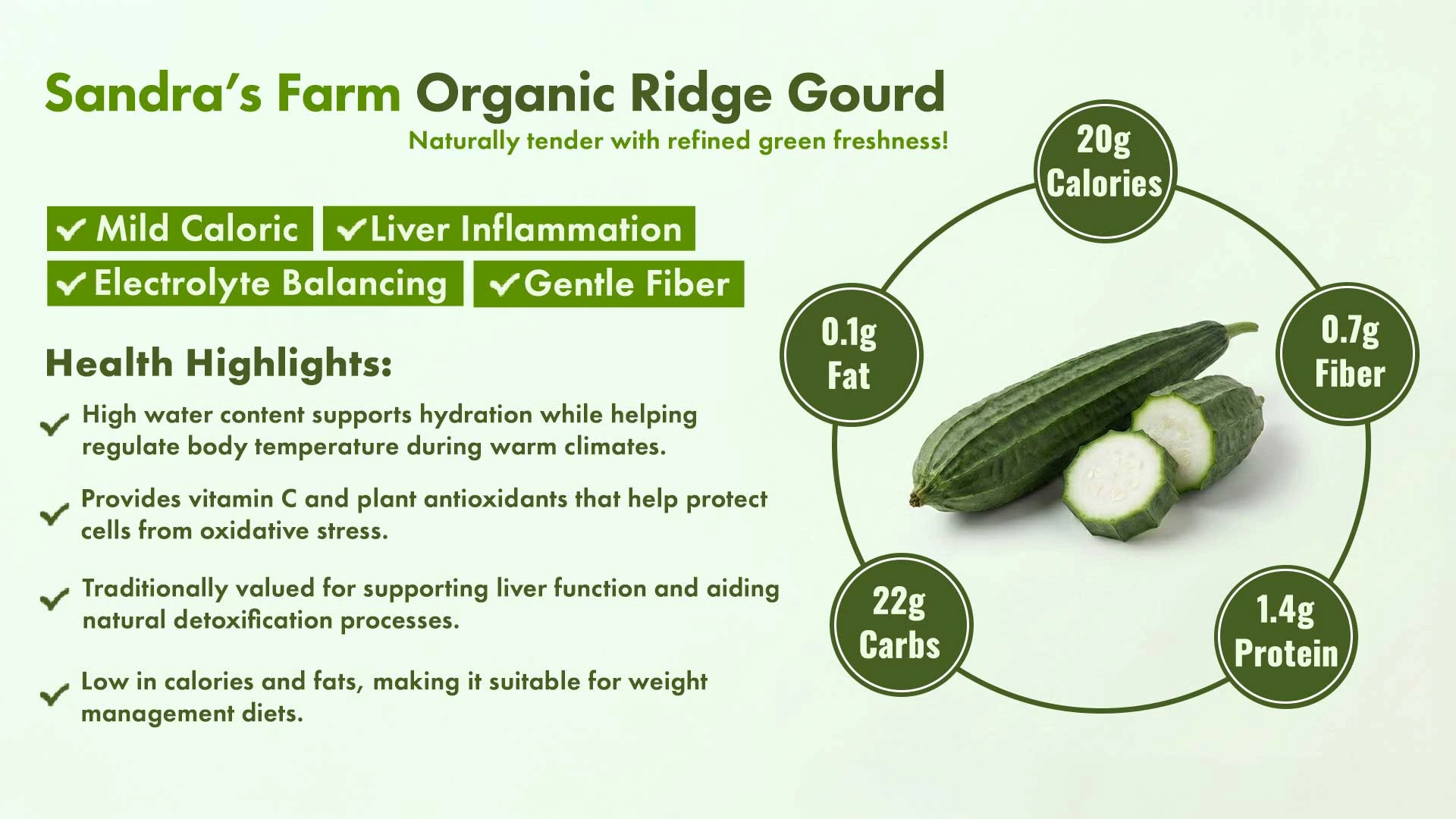 At Sandras Farm Organic Fresh Vegetables, we bring you tender, fresh ridge gourd grown organically and handpicked at the right stage for perfect taste and texture. Light, nutritious, and easy to cook, our ridge gourds are rich in fiber, vitamins, and antioxidants that support healthy living. Ideal for traditional curries, stir-fries, and chutneys, they blend beautifully with spices while retaining their natural freshness. Every ridge gourd from Sandras Farm reflects our promise of purity, sustainability, and farm-fresh goodness. The product image shown is for representation purposes only. Actual product may vary based on season, produce, and availability.